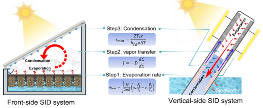 本工作中,针对光热海水淡化装置运行中传质受限问题,借鉴热管高效相变循环原理,创新性设计垂直式零能耗光热蒸发产水装置,通过蒸发与冷凝单元空间解耦、双润湿性界面传质调控及微腔毛细强化冷凝等创新策略,有效解决了传统界面蒸发装置蒸汽滞留、界面热阻过大等难题。户外实测表明,该系统峰值产水速率达 5.57 L m⁻² h⁻¹,为零能耗太阳能海水淡化技术提供了可行的思路。