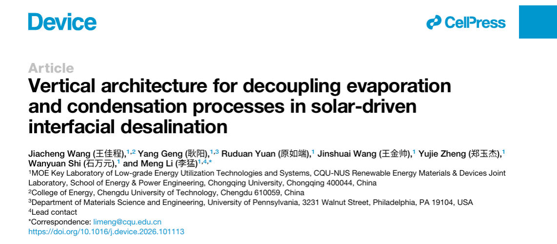 近日,重庆大学能源与动力工程学院李猛教授团队在零能耗太阳能海水淡化技术方向取得新进展,相关成果以研究论文形式发表于Cell Press期刊Device。