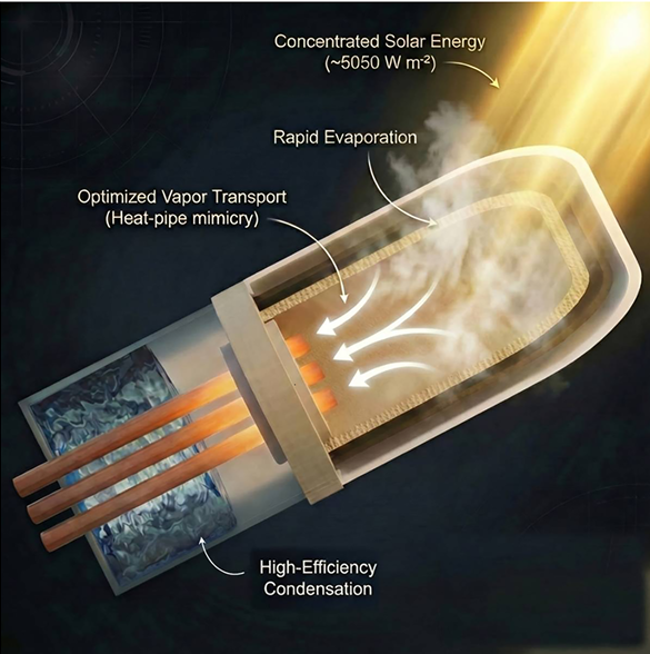 热管式垂直解耦构型:将蒸发单元与冷凝单元在轴向方向上空间解耦,从根本上避免了传统前置式装置中光线与蒸汽的相互干扰。