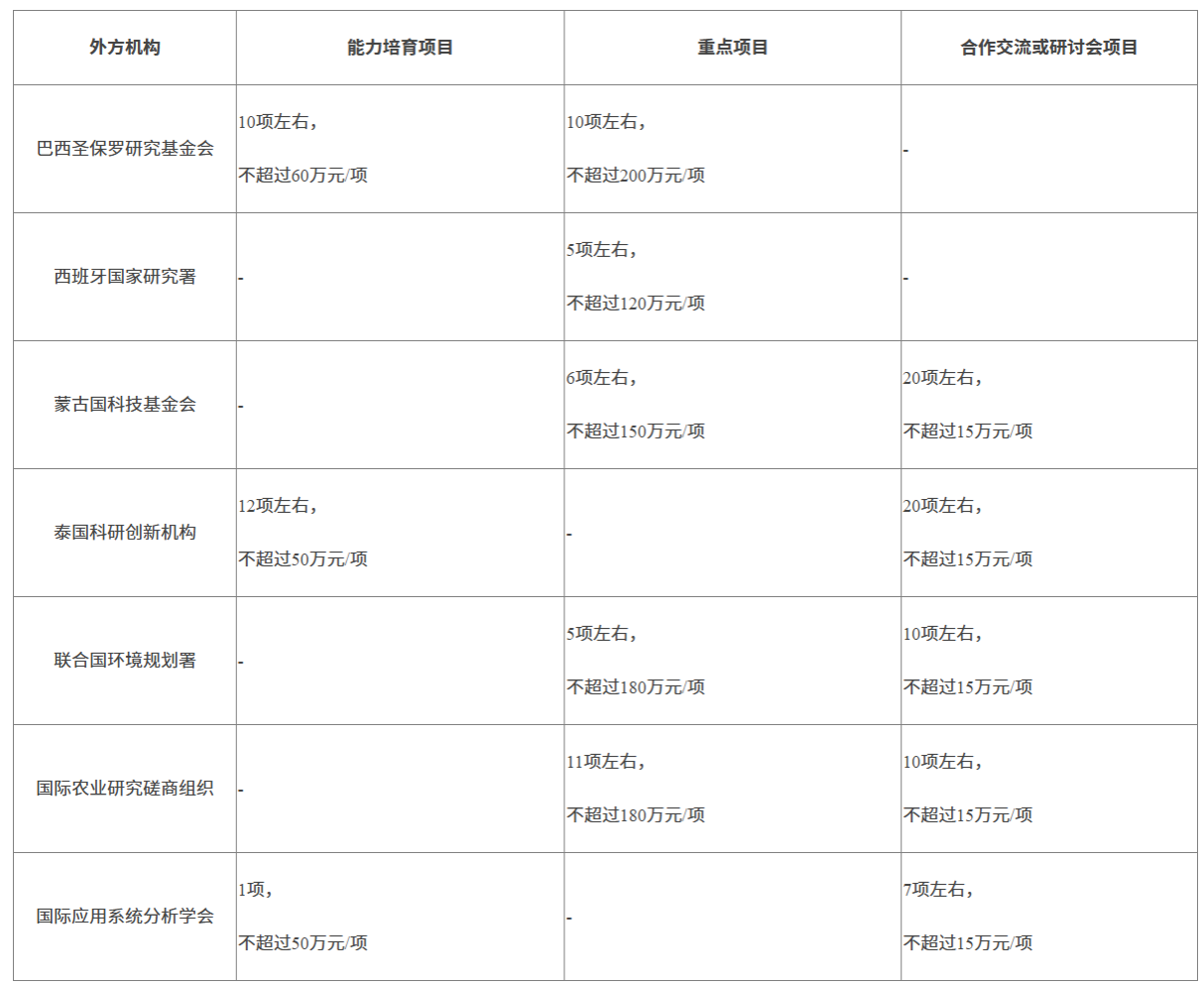 “能力培育项目”旨在支持中外科研人员培育合作关系,可开展包括合作研究、野外考察等多种形式的研究活动。“重点项目”旨在资助中外科研人员在选定领域开展合作研究,共同培养杰出科技人才和解决区域性科学问题,促进提升地区的科研水平与世界影响力。“合作交流项目”旨在支持中外科研人员开展能力建设,可开展包括互访、讲习/培训班等多种交流活动。“研讨会项目”旨在支持中外科研人员召开在华会议及出国会议。