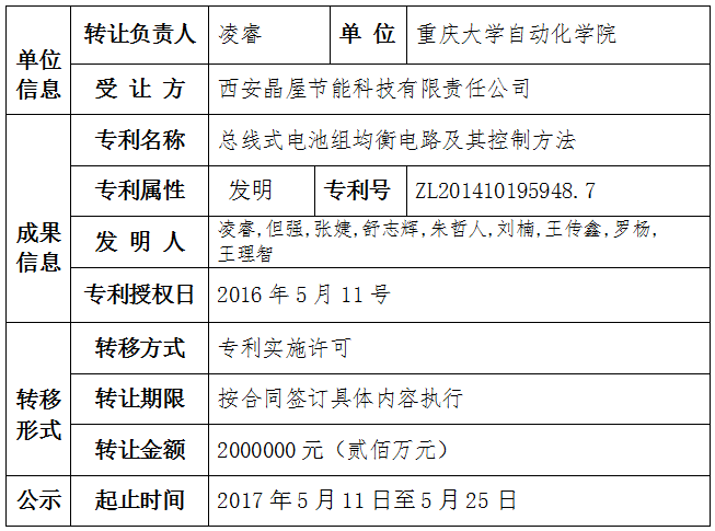 根据《重庆大学促进科技成果转化管理办法(试行)》的规定,科技成果通过协议定价须校内公示15日后才能签订合同。现将以下专利拟签订转让合同的事宜予以公示。在公示期间,校内任何部门或个人如有异议,可通过书面形式实名向科学技术研究处成果转化办公室反映。