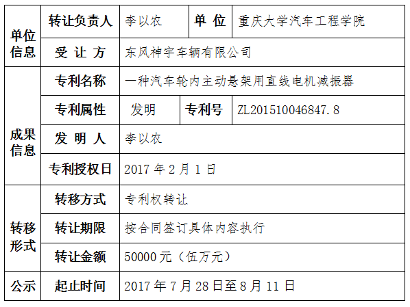 根据《重庆大学促进科技成果转化管理办法(试行)》的规定,科技成果通过协议定价须校内公示15日后才能签订合同。现将以下专利拟签订转让合同的事宜予以公示。在公示期间,校内任何部门或个人如有异议,可通过书面形式实名向科学技术研究处成果转化办公室反映。