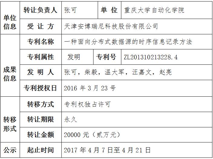 根据《重庆大学促进科技成果转化管理办法(试行)》的规定,科技成果通过协议定价须校内公示15日后才能签订合同。现将以下专利拟签订转让合同的事宜予以公示。在公示期间,校内任何部门或个人如有异议,可通过书面形式实名向科学技术研究处成果转化办公室反映。