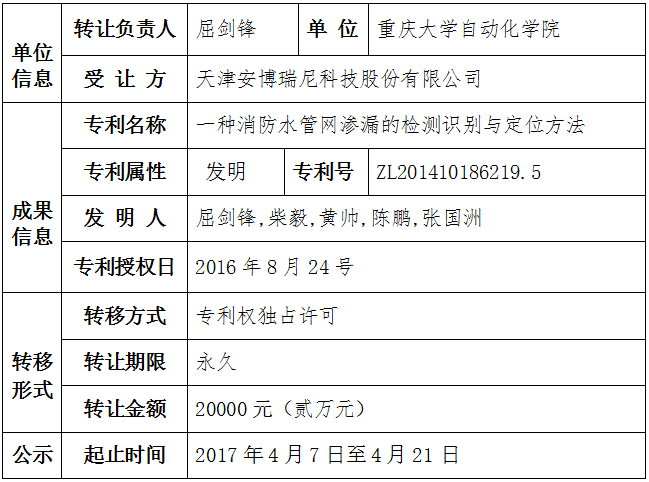 根据《重庆大学促进科技成果转化管理办法(试行)》的规定,科技成果通过协议定价须校内公示15日后才能签订合同。现将以下专利拟签订转让合同的事宜予以公示。在公示期间,校内任何部门或个人如有异议,可通过书面形式实名向科学技术研究处成果转化办公室反映。