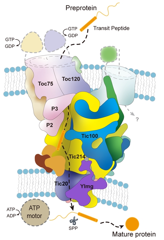 此前,科学界已经知道叶绿体是双膜结构,内膜上存在转运因子TIC,外膜上存在转运因子TOC,它们联合形成一个超级复合物TOC-TIC,作为蛋白进入叶绿体的“大门”。虽然这个领域已经研究了近四十年,但是仍有很多核心问题尚未被解决。比如,TIC到底是由哪些组分组成?而TOC和TIC又是如何形成超级复合物来行使“大门”的功能?由于不知道TOC-TIC复合物的全貌,大家的研究就好像“盲人摸象”,各执一词。
