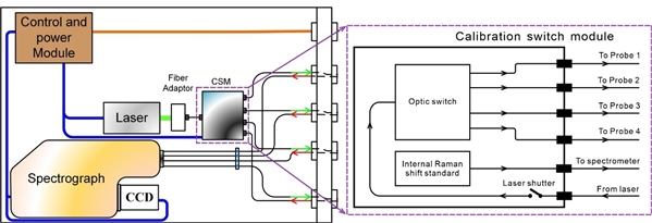 为此,研究团队研制了国际上首套深海多通道拉曼光谱探测系统(Multi-channel Raman insertion probes system, Multi-RiPs),研发光路切换技术,实现了主要光学器件(如激光器、光谱仪、光电传感器等)的分时复用(如图1所示),结合系列化拉曼光谱探针,实现了深海热液、冷泉系统中流体、固体、气体等不同相态目标物的长期原位监测。