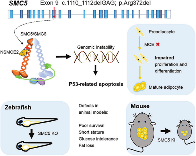 研究小组在患者的原代细胞中发现,细胞增殖减慢,微核和核浆桥比例增加,胞核形态异常,核膜不光滑。通过斑马鱼模型发现,SMC5敲除的导致斑马鱼小头畸形、体长变短和糖代谢异常。研究人员对胚胎期斑马鱼进行分析,发现敲除SMC5激活了相关的凋亡信号,可以部分挽救其生长缺陷表型。进一步在小鼠模型研究发现,该突变导致小鼠生存率显著降低,仅存的纯合子小鼠出现严重的生长迟缓以及脂肪含量减少。在某些细胞中,敲减SMC5导致细胞DNA损伤修复缺陷,阻滞了前脂肪细胞分化为成熟脂肪细胞的早期关键阶段,即有丝分裂克隆扩增,影响了脂肪细胞分化。