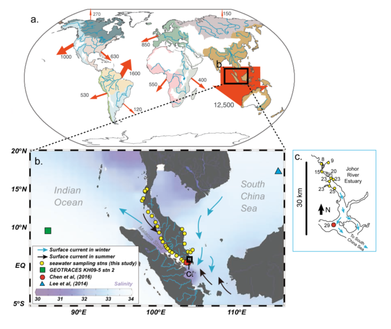 该研究团队通过野外采样、实验室分析、数据集成与模型计算等手段,对马来半岛周围多个站位的海水同位素数据进行综合评估分析,发现海水铅同位素组成并不能用河流与海洋的混和来解释。基于模型的计算结果则发现,河流输入颗粒物与海水的铅交换可以很好地解释马来半岛周围海水的铅同位素异常。模型研究进一步表明,颗粒态-溶解态交换导致由颗粒物向海水转移的铅元素净通量,会随海水浓度升高而降低。由于人类活动的影响(如含铅汽油的使用),当今许多地区表层海水的铅浓度较高,陆源颗粒物可能会成为海水铅汇,但对人新世之前的海洋,由于海水铅浓度较低,颗粒态-溶解态交换的净效果使得陆源颗粒物成为重要的海水铅源。