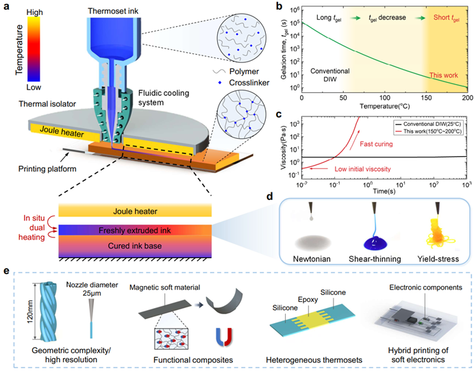 中国科学技术大学工程科学学院机器人与智能装备所副教授李木军、近代力学系特任教授王柳与南加州大学教授Yong Chen合作,提出了一种原位双重加热(ISDH)策略,成功实现了对具有多种流变性质和功能特性的热固性材料的墨水直写(DIW)打印。相关研究成果日前发表于《自然-通讯》。