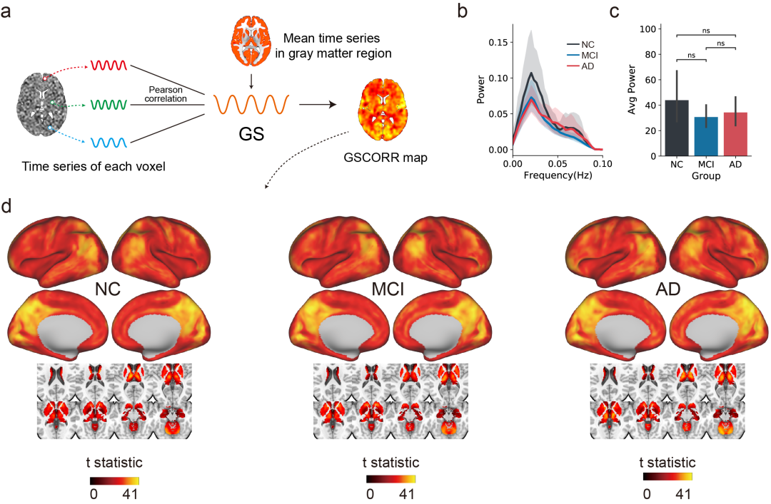 研究人员用国内多家医院建立的多中心阿尔茨海默病数据库(MCADI)和美国阿尔茨海默病神经影像学计划(ADNI)共131例数据进行研究。计算了GS时间序列的信号能量,发现阿尔茨海默病患者未出现显著的全脑信号时间序列能量变化。此后,他们利用局部脑活动时间序列与全脑信号时间序列的相关性(GSCORR),作为全脑信号在全脑分布的指标,发现全脑信号空间分布在正常人和病人上具有相似的模式,都在后扣带、楔前叶、顶下小叶等部位呈现较高水平。