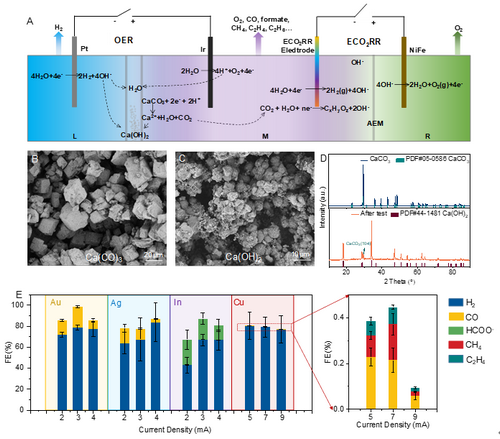 (A) 电解池体系中石灰石电化学转化为消石灰和碳质产物过程的示意图;(B)生石灰、(C)消石灰扫描电子显微镜图像及(D) X射线衍射谱图;(E) 不同金属电极在生石灰中性电解液体系中生成有价值碳质产物的法拉第效率。南开大学供图