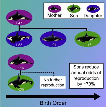 研究人员对现有数据的分析发现,雌性虎鲸幸存的断奶儿子的数量,与其每年生产可存活幼崽的概率之间存在很强的负相关性。这些负相关性也没有随着虎鲸儿子的长大而减少。