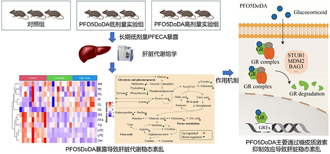 近日,中科院大连化物所高分辨分离分析及代谢组学研究组(1808组)许国旺研究员团队与烟台大学药学院王建设教授团队合作,在全氟醚羧酸(PFECA)毒性效应和作用机制研究中取得新进展,发现了PFO5DoDA(全氟-3,5,7,9,11-五氧十二烷酸)通过糖皮质激素抑制效应导致肝脏稳态紊乱的机制。