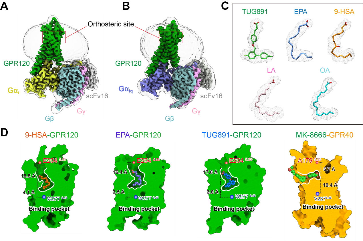 A-B, Omega-3鱼油受体-Gi/Giq冷冻电镜结构;C, 多种不同配体的电镜密度;D, Omega-3鱼油受体(绿色)的配体结合口袋与其他脂肪酸受体(黄色)配体结构口袋的比较。(课题组供图)
