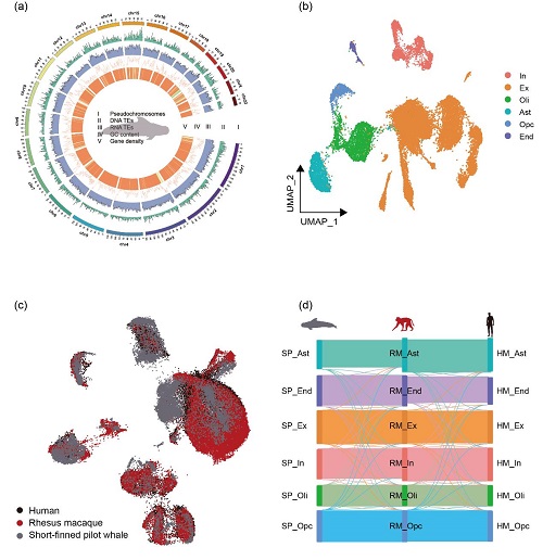 (a) 短肢领航鲸染色体圈图;(b) 脑皮层细胞类型的UMAP图;(c) 短肢领航鲸、人类和猕猴皮层细胞的UMAP图;(d) 显示短肢领航鲸(左)、猕猴(中)、人(右)皮层细胞类型之间连通性的桑基图 中国科学院深海科学与工程研究所供图