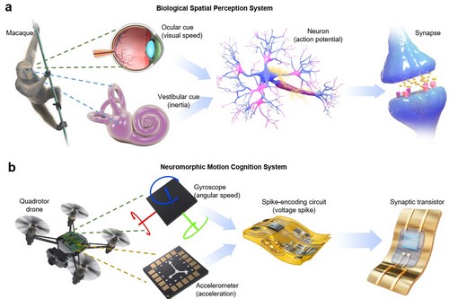 a 哺乳动物具有的视觉神经/前庭神经跨模态运动感官系统;b 基于柔性突触晶体管的神经形态运动感知系统 南开大学供图