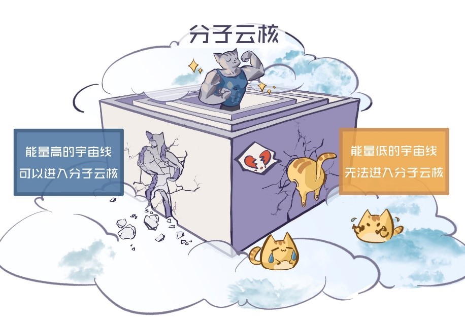 不同能量的宇宙线进入分子云致密核心的能力也不同,高能的可以轻松穿透,低能的大多被屏蔽在外(卡通示意图,中国科大供图)。