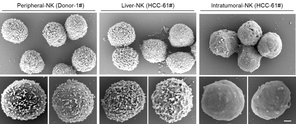 外周血和肝脏组织来源的正常NK细胞表面呈现丰富的膜凸起(左、中),而肿瘤组织微环境NK细胞表面异常光滑,膜凸起丢失(右) 中国科大供图