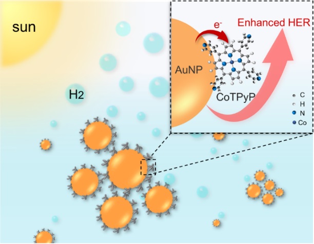 “基于局域表面等离激元效应,处于等离激元纳米结构周围的这些分子催化剂的催化活性可以显着提高。” 吕刚介绍,课题组通过将外端带有四个吡啶基的钴卟啉分子与金纳米颗粒进行复合,利用金颗粒的等离激元效应激发钴卟啉分子催化剂的活性,从而提升催化反应的效率,成功地开发出一种高效且稳定的析氢光催化剂,获得的周转频率高达每小时4650。
