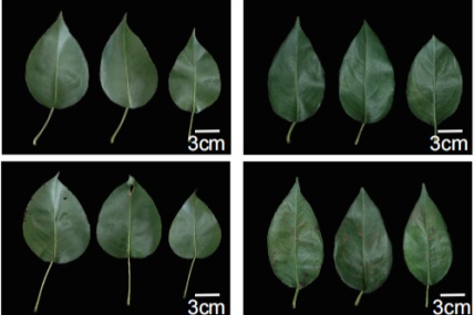 “华山”(左列)与“翠冠”(右列)的健康叶片(上排)和染病叶片(下排)对比。JIA供图