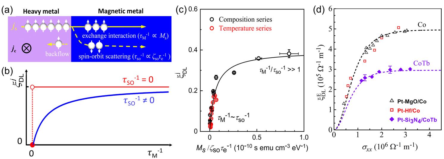 图2.自旋轨道矩随相对自旋弛豫速率的变化关系。 (a) 不同自旋弛豫过程的竞争:交换相互作用与自旋轨道散射。(b) 自旋轨道散射可忽略和不可忽略情形下,特定体系的自旋轨道矩效率随自旋-磁矩交换相互作用的自旋弛豫速率(τM-1)的变化关系。(c) Pt0.75Ti0.25/FexTb1-x 双层膜中自旋轨道矩效率随Ms/ζsoτe-1 ( α相对弛豫速率)的变化关系. (d) 相同电荷电导率下,Pt基重金属产生的自旋流施加给亚铁磁Co0.65Tb0.35的自旋轨道矩强度仅为施加给3d铁磁Co的58%。