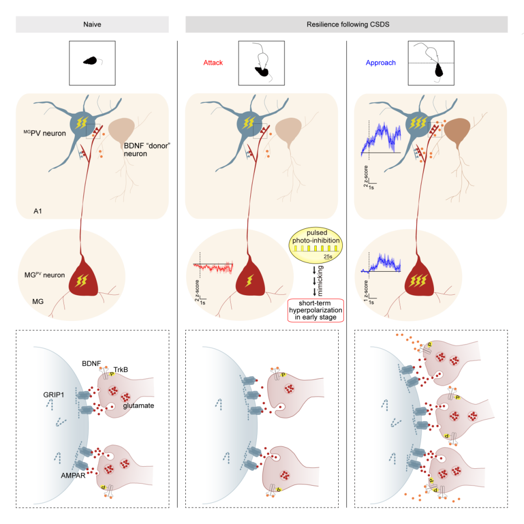 朱心红团队研究发现,面对应激时,抑郁非易感小鼠内侧膝状体谷氨酸能神经元形成超极化,引起初级听皮层的PV(parvalbumin)神经元一方面启动内源性稳态机制维持其兴奋性,另一方面,促进相邻的兴奋性神经元释放脑源性营养因子,作用于内侧膝状体投射神经元的末梢,从而增强丘脑—皮层环路功能对抗应激;但,抑郁易感小鼠缺乏类似的“韧性”机制。同时发现,应激事件引起的内侧膝状体谷氨酸神经元超极化是“心理韧性”的早期事件,为发展精神疾病人群筛查生物标记提供了科学依据。