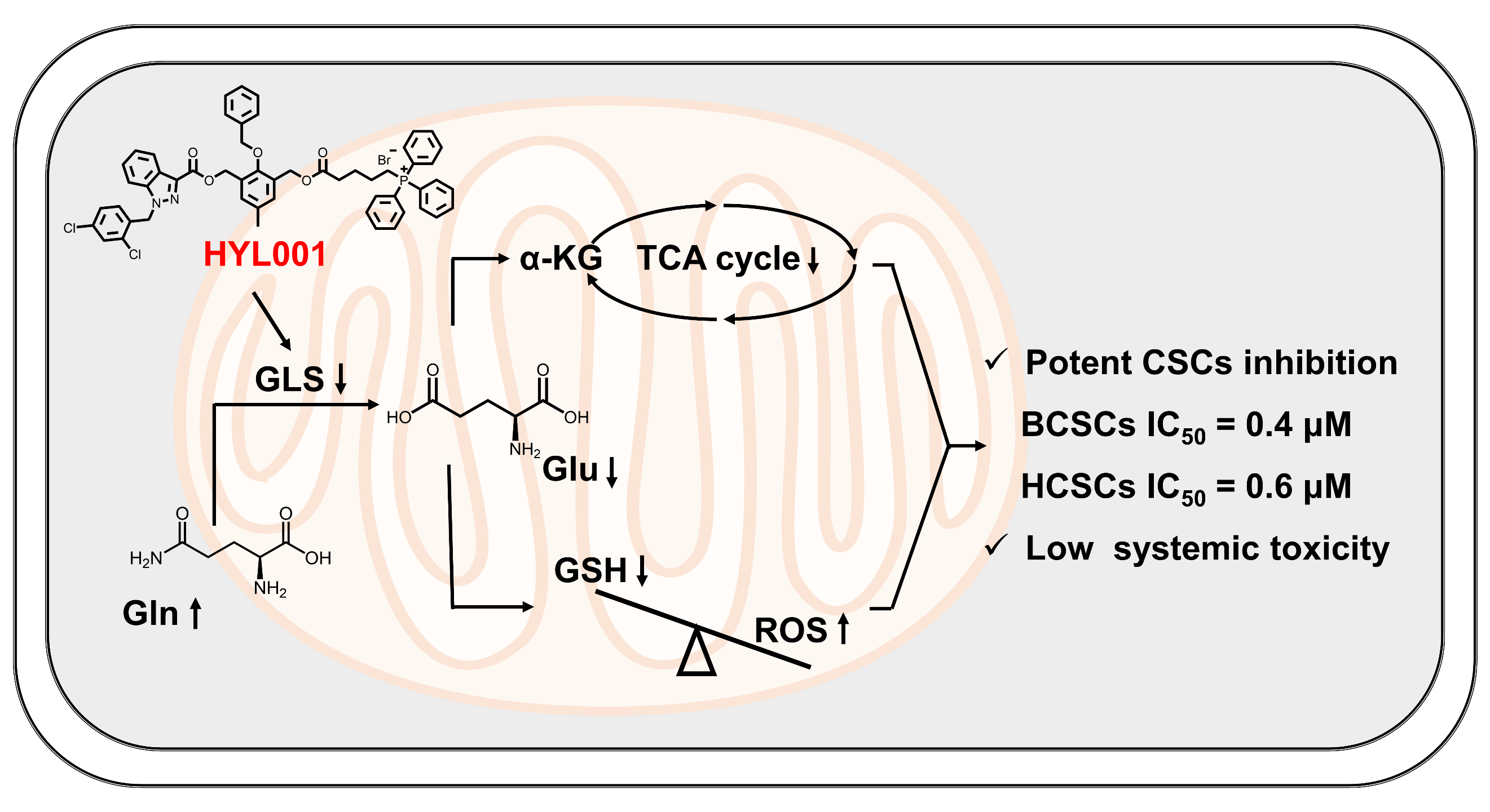 基于以上背景,科研团队的研究以临床在研药物氯尼达明(LND)为药效团,与线粒体靶向单元阳离子三苯基磷(TPP+)偶联,得到命名为HYL001的候选化合物。研究结果显示,对比LND,HYL001对乳腺癌干细胞和肝癌干细胞的IC50分别降低了约380倍和340倍,机制研究揭示了HYL001通过抑制谷氨酰胺酶的表达,阻滞谷氨酰胺代谢,抑制三羧酸循环,放大线粒体氧化应激,最终诱导肿瘤干细胞凋亡。