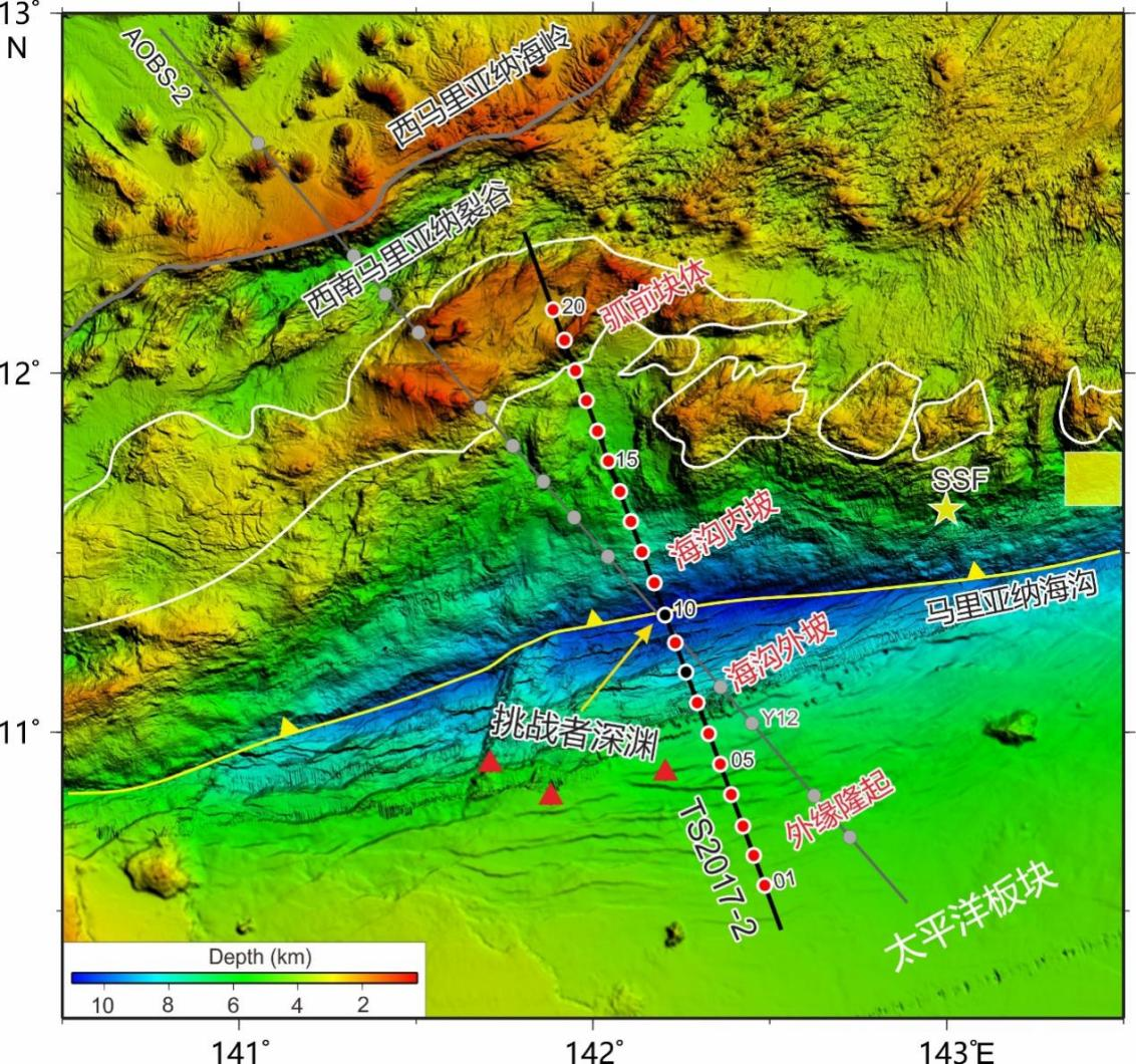 2017年1-3月,研究团队搭载TS03航次在马里亚纳俯冲带南段横穿“挑战者深渊”布设了一条230 km长的广角深地震测线TS2017-2,该测线垂直海沟走向,包括了多个构造单元。沿测线共投放和回收18台主动源海底地震仪(OBS)。其中,在海沟内成功投放和回收了我国最新研发的万米级OBS,坐底最大水深为10060米,使我国成为世界上首个成功获取万米级海洋人工地震剖面数据的国家。