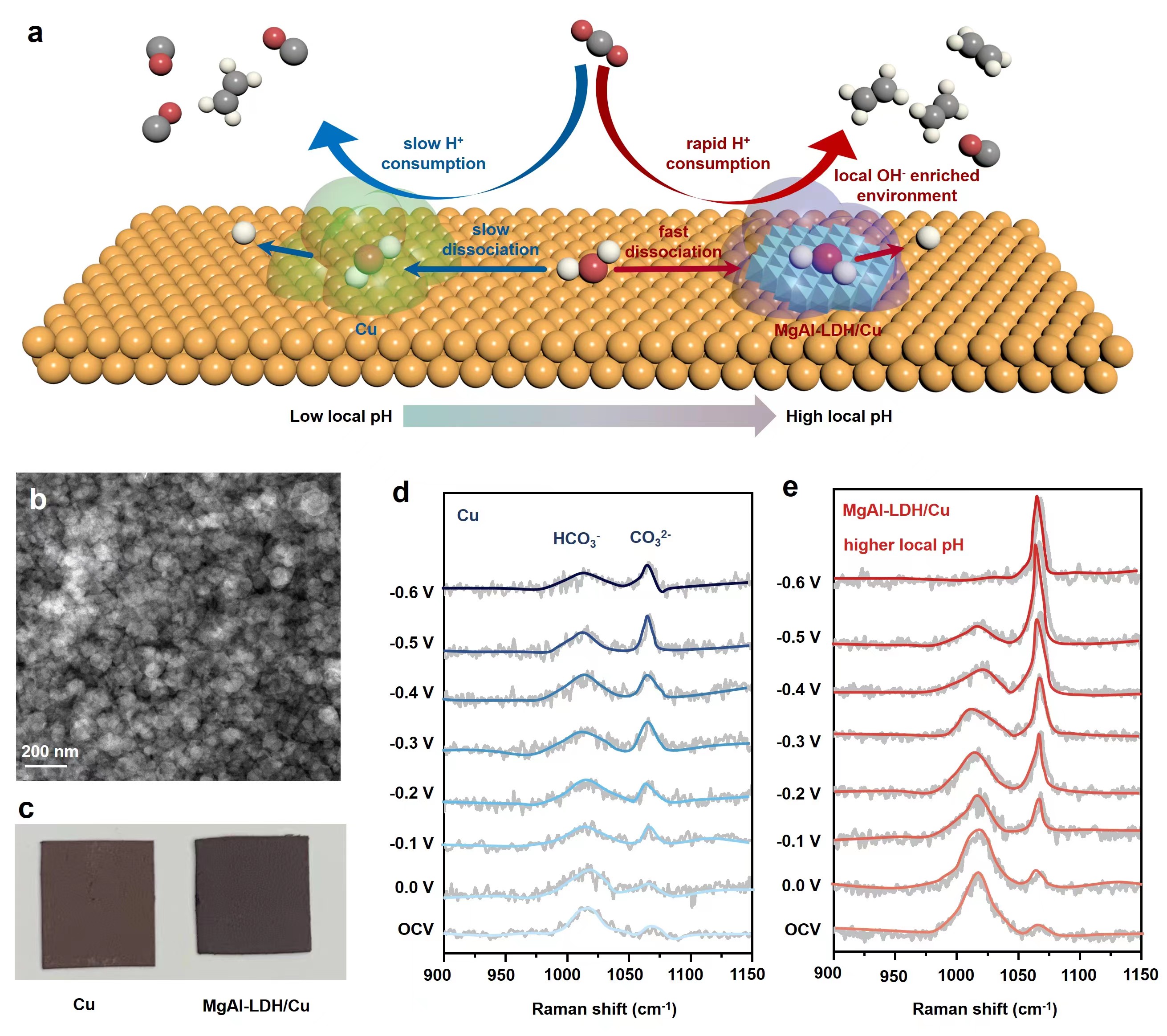 针对这一问题,研究团队通过在铜电极表面引入低成本的单层双金属氢氧化物(LDH)无机改性剂,构建了一种稳定的界面结构,促进反应过程中水解离生成OH-离子,用于调节中性电解质中Cu电极表面的局域pH值,并将其应用于高效乙烯(C2H4)电合成过程。该界面结构电极在反应中表现出优异的CO2到C2H4转化活性。原位光谱和理论计算表明,在外加电位作用下,该界面结构促进了H2O的快速解离并提供了高浓度的OH-离子,修饰后的催化电极界面在中性溶液中具有高于Cu电极表面的局域pH值。该工作证明了无机改性剂在调节局域化学反应环境的可行性,为小分子电化学转化领域高性能、低成本催化电极材料设计提供了新思路。