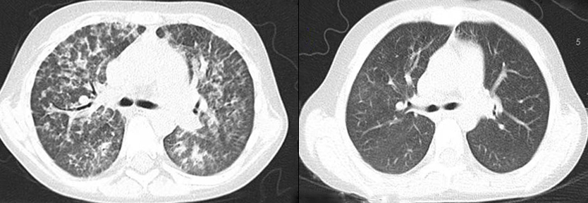 童童术前(左)和术后(右)CT对比,肺泡蛋白沉积症状显著改善。