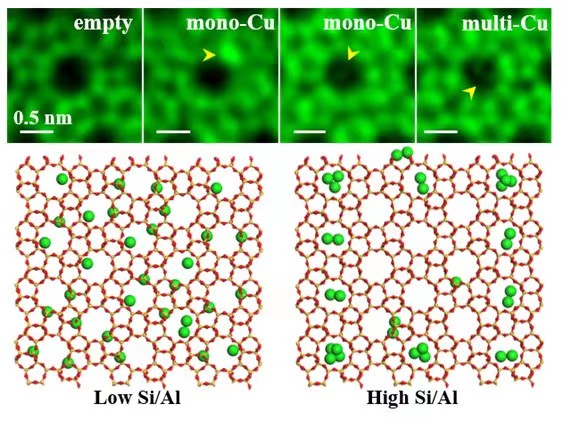 铜基分子筛催化剂被广泛应用于氨选择性催化净化、一氧化氮直接解离、甲烷直接氧化制甲醇等多种催化反应。在原子尺度准确识别分子筛孔道中铜物种结构,明确铜物种构型与反应性能之间的构效关系,对发展性能更为优异的铜基分子筛催化剂具有重要意义。然而,电子束对分子筛骨架的辐照损伤阻碍了铜基分子筛材料本征结构的电子显微成像,长期以来缺乏原子尺度的实空间证据,导致大量关于负载铜的尺寸、落位、构型等争议问题。
