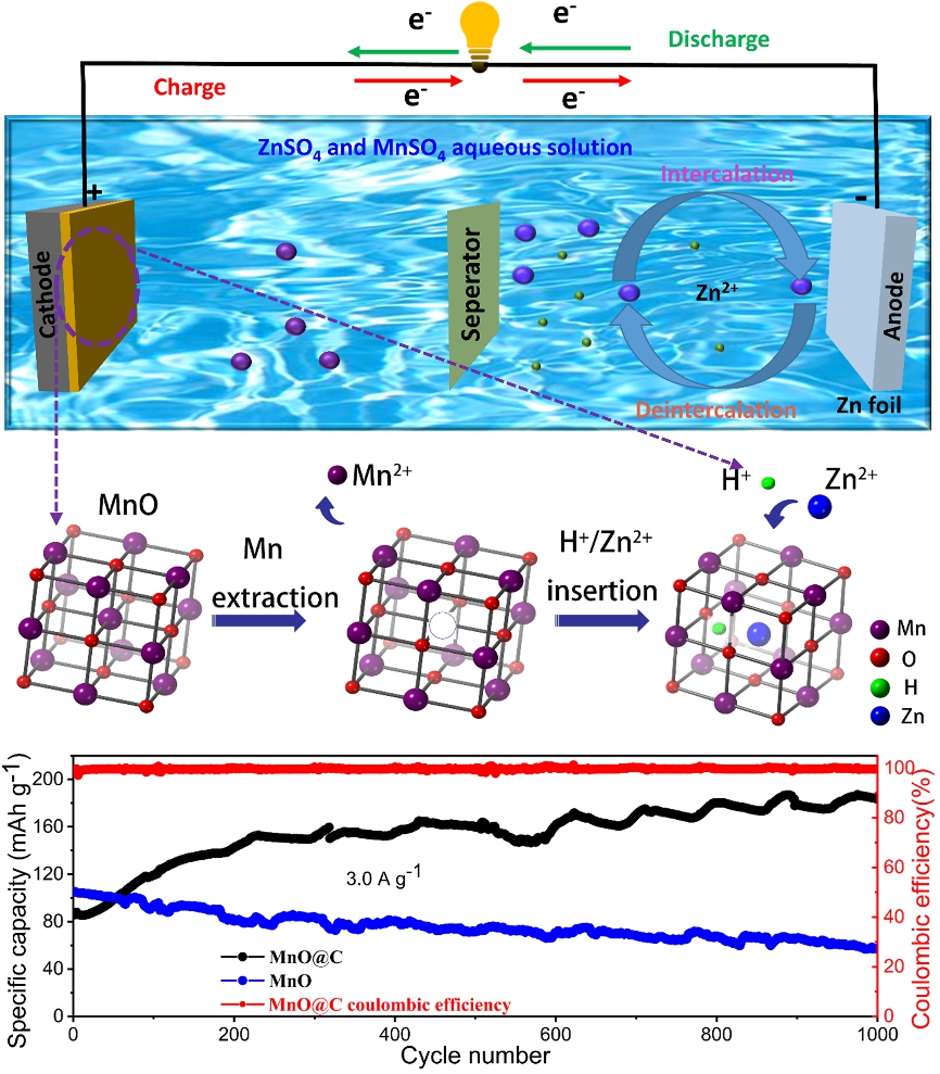 “与纯氧化锰材料相比,氧化锰/碳复合材料展现出了超高的比容量和循环稳定性(在1 A/g电流密度下的比容量412.4 mAh/g)。这主要是由于氧化锰/碳与碳涂层之间的强相互作用加速了离子/电子转移,并抑制了材料中二价锰离子的溶解。”尹成杰说。