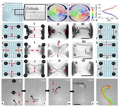 在研究过程中,研究团队还阐明了预设计的拓扑缺陷如何控制胶体颗粒在向错线上的运动机制,此机制由液晶局部预设计的展开和弯曲形变的弹性特性来决定。因此,此光驱动可编程胶体自组装的物理机制在于,通过光照使纳米尺度的分子机器进行协同重组,利用分子机器与液晶分子的相互作用控制纳米尺度液晶分子取向的变化。由于液晶分子具有长程有序的特性,引发表面宏观尺度液晶分子取向的变化。此宏观变化进一步通过表面锚定驱动样品内部液晶微结构的变化,从而实现了宏观尺度的向错线网络和胶体自组装的重构。