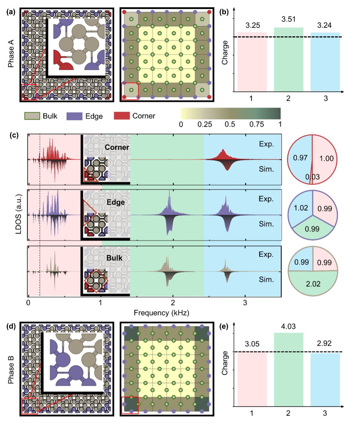 在本项研究中,研究人员在构建的声子晶体中测得了表现为分数化谱电荷的拓扑角模式反常,这种模式反常可以作为一种易于观测的实空间拓扑指标对湮灭在体态中的拓扑角模式进行先验判别。