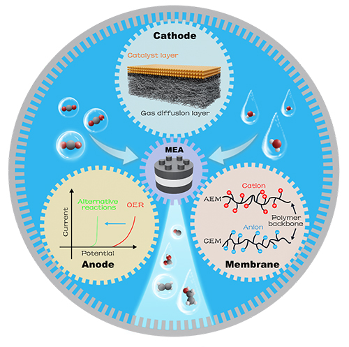 综述首先讨论了膜电极电解池中各组件的特点和工作方式,包括阴极气体扩散电极、离子交换膜、阳极氧气析出的替代反应等。接着,团队分析了膜电极各部件的电压降及其相应的测量方法,为电催化CO2还原的能耗解析提供参考。