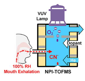 近日,中国科学院大连化学物理研究所研究员李海洋团队基于自主研发的大气压负离子飞行时间质谱仪器,提出了一种检测呼出气中氢氰酸的气流辅助光电离质谱方法。