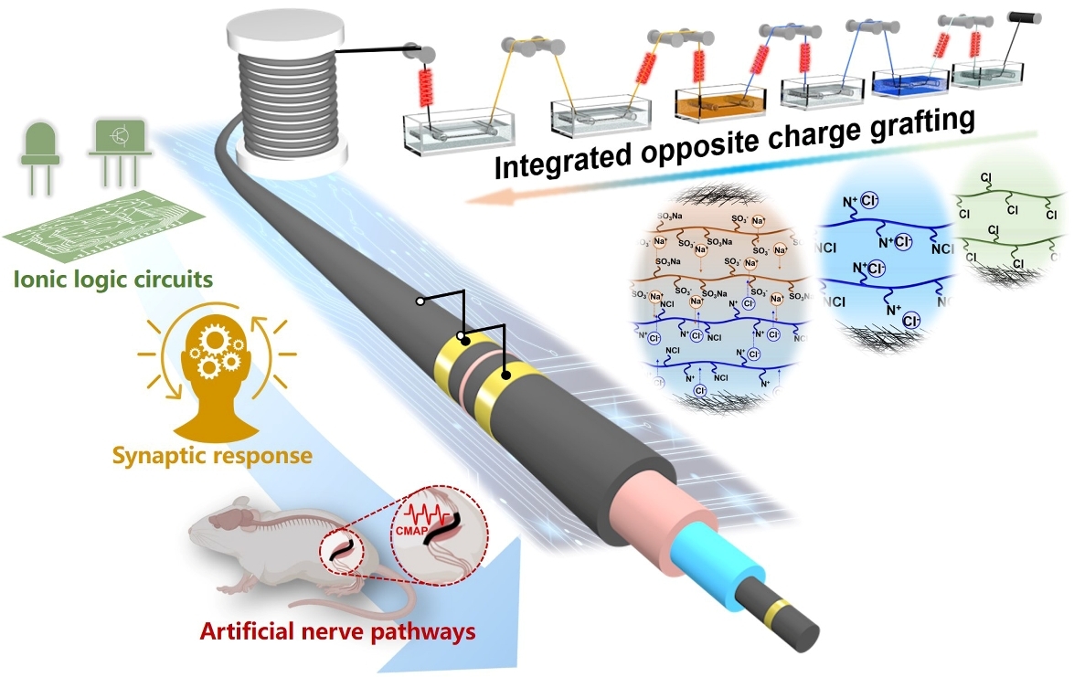 东华大学研究员王刚、朱美芳院士等联合复旦大学附属华山医院手外科副教授蒋苏等,首次在一维曲面结构表面实现了纳米尺度离子异质结的可控构筑,获得了具有千米级制造潜力的电子-离子杂化半导体功能纤维器件。基于信号在纤维离子结界面的单向传输特性,设计开发了纤维状离子半导体核心元器件(离子二极管、离子双极结型晶体管),并通过集成的纤维离子逻辑门,初步实现了离子信号的“0-1”逻辑运算。此外,其可作为神经接口,实现对周围神经损伤后远端神经的持续电刺激,延缓远端肌肉萎缩,为神经损伤后错过早期治疗的患者恢复更好的运动功能提供了可能性。相关研究近日发表于《自然—通讯》。