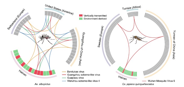 在海南岛,不同蚊种的病毒组成明显不同,相同蚊种的病毒组成在不同地点和不同年份能够稳定维持。出乎意料的是,当选择代表性蚊种,进行跨大陆地理空间病毒组比较分析发现,相同蚊种病毒组却存在较大的差异,这说明同蚊种病毒组的稳定性是相对的,在大的地理尺度上这种特异性和稳定性并不存在。研究者推测,在较小地理区域内由于蚊种间的竞争和食物来源的限制,病毒组相对稳定。在较大地理区域,由于食物来源和环境因素差异很大,同种蚊虫病毒组的变异受到多个生态因子相互作用的影响,表现出变化明显,种特异性病毒组并不突出。