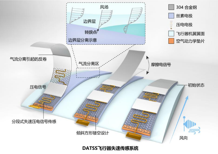 为解决这些痛点问题,联合团队基于此前在自驱动传感、自驱动智能监测、智能输入设备等领域的积累,研发出一款自驱动轻质化,原位监测翼面气流分离程度的新型失速传感系统(DATSS)。
