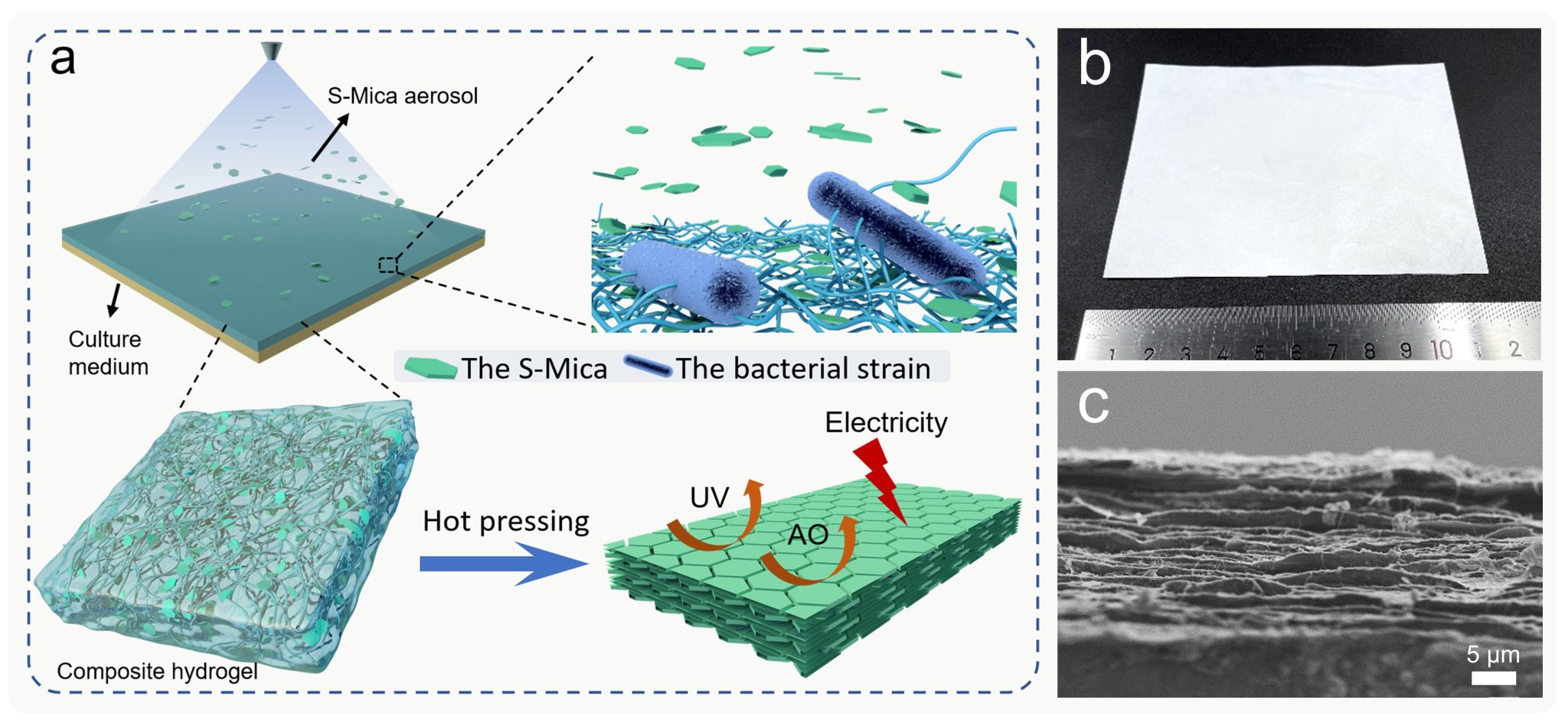 受天然珍珠母“砖-泥”结构的启发,在此次工作中,研究人员首先采用气溶胶辅助生物合成方法,利用细菌产出的纤维素纳米纤维将分散的合成云母纳米片均匀而紧密地缠结得到复合水凝胶,然后通过热压的方式,得到最终的仿珍珠母结构的纳米纸材料。