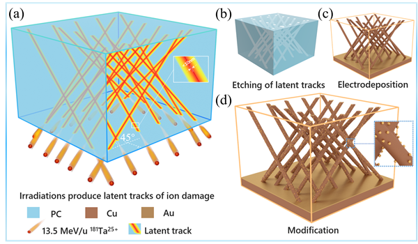科研人员基于兰州重离子研究装置(HIRFL),利用核径迹技术构建了一种新型三维多孔复合框架结构。该结构由三维纳米铜骨架和均匀分布的亲锂位点构成,将其与锂金属复合作为锂离子电池负极。该复合框架结构表现出超过2000小时的长循环寿命和高速率能力。即使在高面积容量和高电流密度下,复合负极在运行600小时后仍表现出稳定的循环性能。