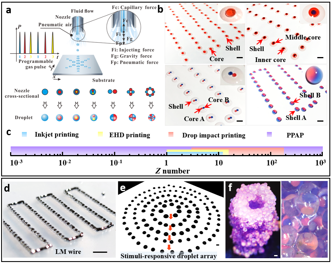 研究团队建立了多界面液滴制备的理论预测模型,揭示了PPAP实现宽Z数液滴打印的力学机理。通过数值模拟结合高速图像分析,展示了液滴形成过程的稳定性和可重复性。研究团队证明了PPAP的广泛的材料适用性,实现了不同尺寸的液滴的连续和可编程化打印,并可广泛用于各种乳液、微颗粒以及微胶囊的精准制备。研究团队进一步展示了PPAP技术在细胞封装、药物传输、柔性电路和3D亚体素微结构等领域的应用潜力。由于液滴生成空间较为开放,颗粒的制备过程无需油相驱动和添加表面活性剂,从而解决了传统载细胞微颗粒制备过程复杂的痛点。利用PPAP技术的气流强剪切作用,研究团队实现了液态金属柔性电路的可控制造,拓宽了液态金属的应用范围。同时,基于PPAP技术的可扩展性和主动可编程性,成功获得了智能响应性微胶囊梯度阵列。最后,研究团队利用三维运动平台,成功制备了3D亚体素微结构。