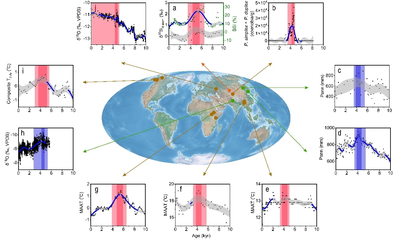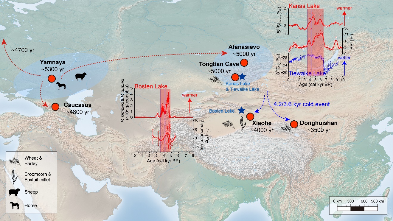 兰州大学教授黄小忠团队以位于阿尔泰山南坡的喀纳斯湖和临近的铁外克湖为研究对象,利用喀纳斯湖沉积物硅藻硅同位素和生物硅等指标揭示了该地区全新世以来的温度变化历史。结果发现,在6.5-3.6ka时段,阿尔泰山地区气候总体温暖,喀纳斯湖硅藻生长繁盛,期间在4.7-4.3ka气候异常温暖,湖水分层,硅藻利用同位素偏重的溶解硅。结合铁外克湖钻孔孢粉、碳氮同位素等指标,并与区域湿度记录对比,显示在6.5-3.6ka期间阿尔泰山地区的气候适宜,温暖湿润的气候吸引了在里海西北部暖干环境生活的颜那亚人群,在约5ka左右迁移到西伯利亚南部及阿尔泰山地区,稍晚在更温暖的4.8-4.7ka期间,里海的水位因高温干旱变低,颜那亚人迁徙到高海拔的高加索地区以及纬度更高的北欧地区。这项研究为中亚地区史前人口扩张的驱动力提供了新视角和新证据。