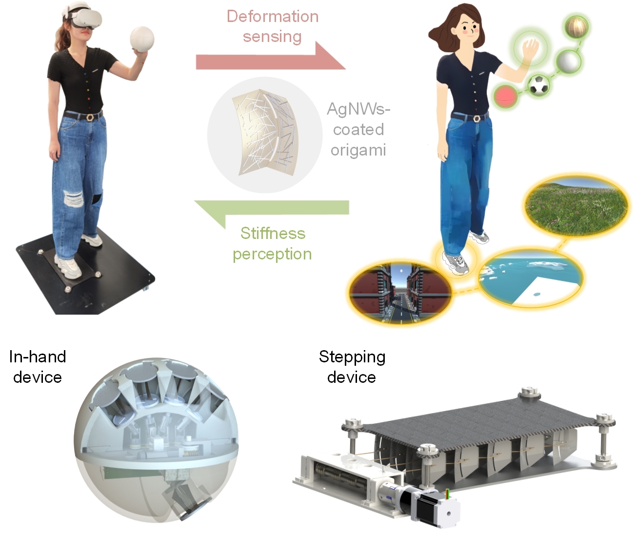 他们研发了一套“高保真主动机械触感交互系统”,利用不同材质、不同尺寸的折纸模块搭建了两种不同维度的交互装置:一种可引发局部触感的手持式装置,与一种可以产生全身体感的脚踏式装置。在使用手持式交互装置时,用户可通过主动抓握,体验其所交互的不同物品的软硬程度;在使用脚踏式装置时,用户则可通过主动踩踏,以全身运动的形式体验其所处的环境地面特性。
