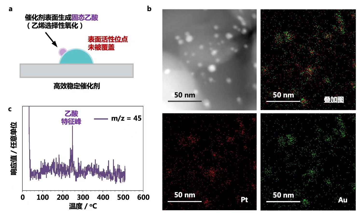 研究团队通过理性分析乙烯低温催化氧化过程,发现乙烯较难高效深度氧化为最终产物二氧化碳,而主要被转化为乙醇、乙醛、乙酸等中间体形式沉积在催化剂表面。进一步结合各个中间体在冷链工况下的物态性质,研究人员推断若可将乙烯选择性氧化为乙酸这类固态的中间物,将有利于长时间暴露催化活性位点,从而大幅提升催化剂在冷链条件下的催化氧化乙烯稳定性。