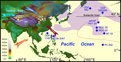 论文第一作者和共同通讯作者昝金波介绍,地球生态系统海洋的营养物质通过河流和粉尘补充,大陆粉尘携带的铁元素在风力搬运作用下进入海洋,引起浮游生物增加,并消耗大量的二氧化碳,缓解温室效应的危害,称之为粉尘的“铁肥料效应”。已有观测表明,亚洲内陆大气粉尘中铁元素等营养物质通过高空西风环流传输到西北太平洋地区,促进了浮游植物的繁盛。地质历史时期,亚洲内陆粉尘是否同样可以通过“铁肥料”效应强化北太平洋生物固碳作用,并对全球气候环境产生重大影响?