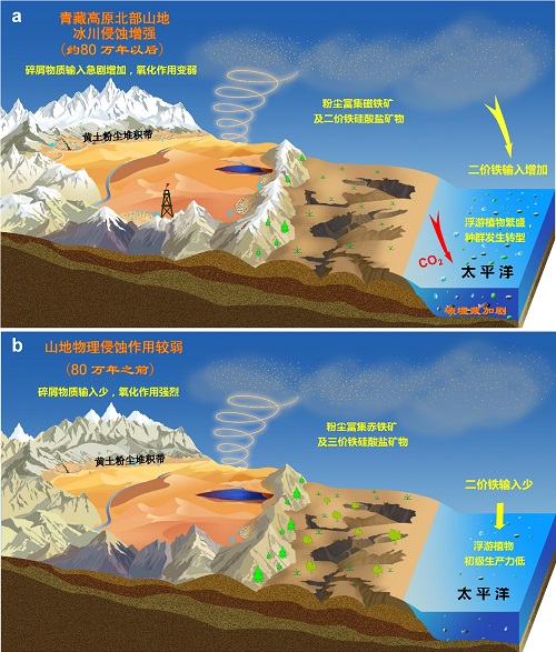 图2 高原北部冰川侵蚀增强驱动亚洲沙尘Fe化学组成和太平洋生态系统转型。(中国科学院青藏高原所供图)
