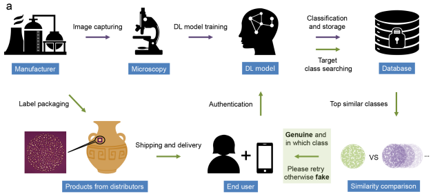 为应用到实际防伪场景,研究人员开发了一种基于深度学习算法的图像PUF识别验证系统,借助ResNet50分类神经网络模型对37000个PUF标识符实现了可溯源、快速、高精度(0%假阳性)验证,并提出了一种动态数据库策略,赋予深度学习模型极高的数据库扩容能力,理论上打破了庞大数据库的建立与低时间成本之间难以兼容的障碍。