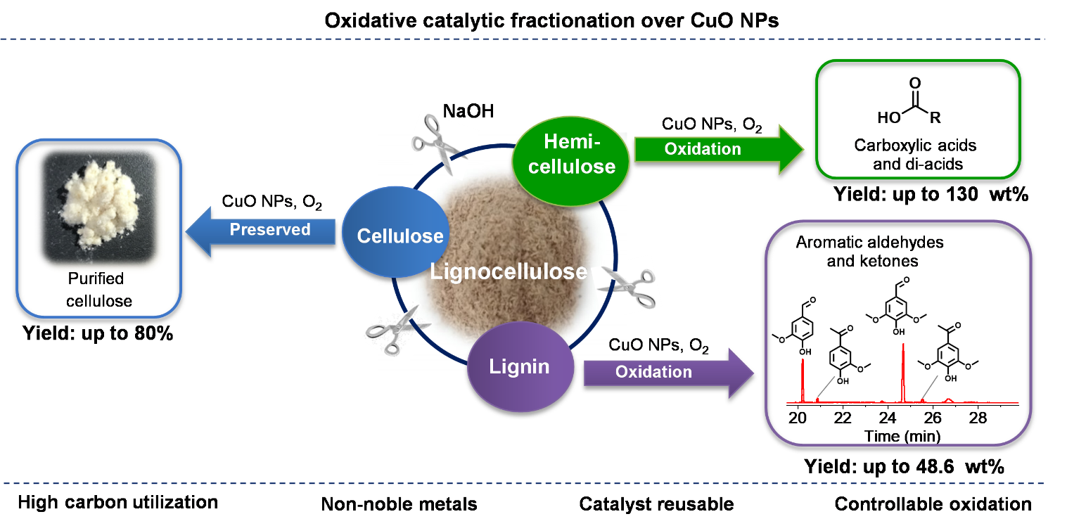研究发现,温和条件下成本较低的纳米氧化铜颗粒(CuO NPs)表现出优异的催化氧化分离性能,在将木质素催化氧化为芳香醛酮的同时抑制了纤维素水解,该方法获得的高附加值单体和材料(纤维素)的碳效率达80%。其中,木质素被转化为芳香单体(主要为香兰素和丁香醛),转化率高达48.6 wt %。