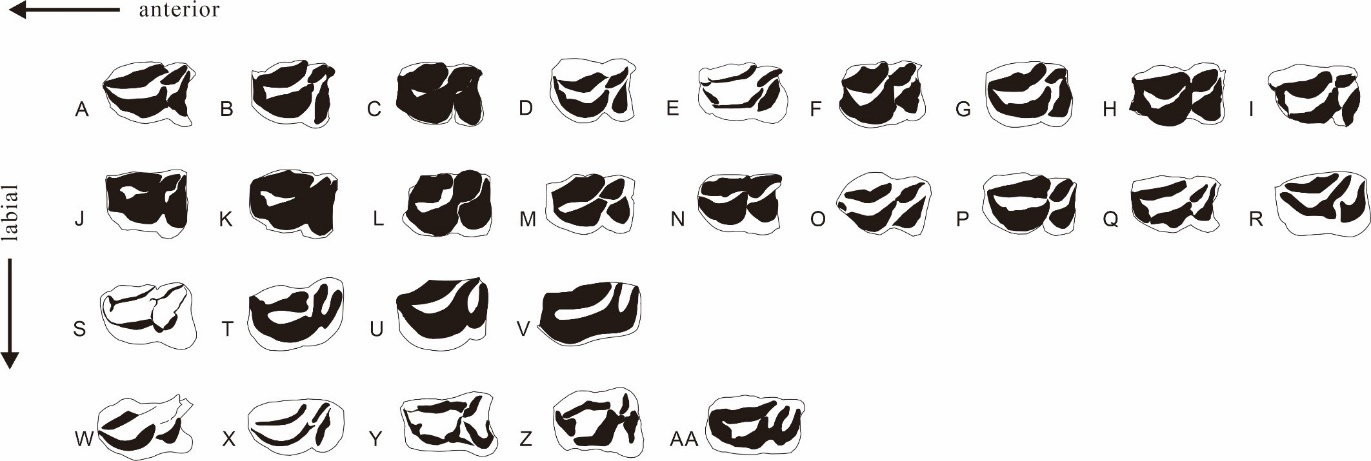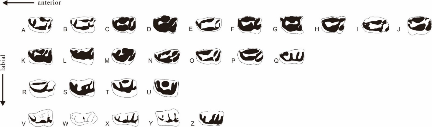 图4化石长颈鹿类下第三前臼齿咬合面模式